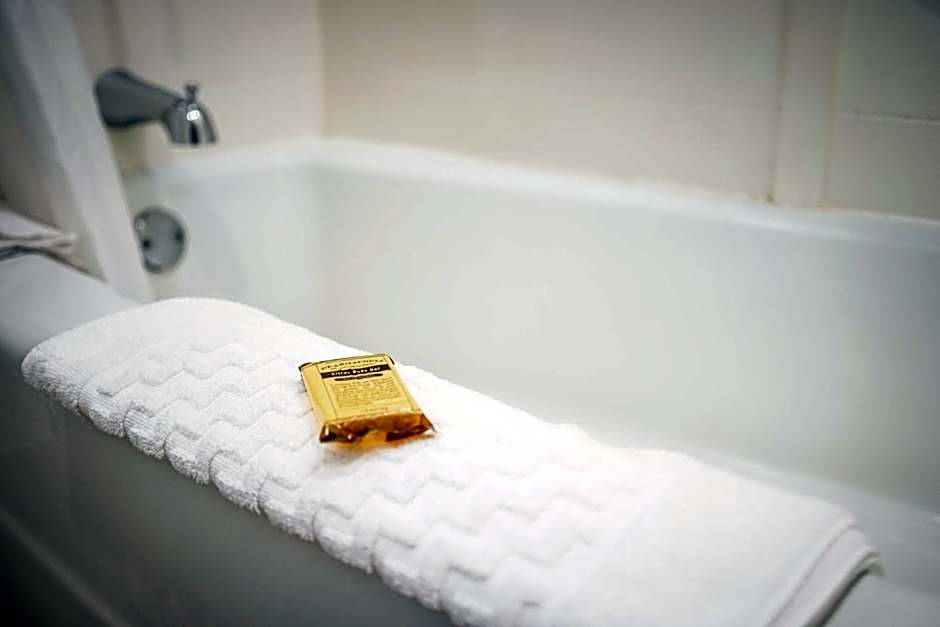 This room offers handicap-accessible amenities, including a private bathroom with an adapted bath, raised toilet and safety grab bars.